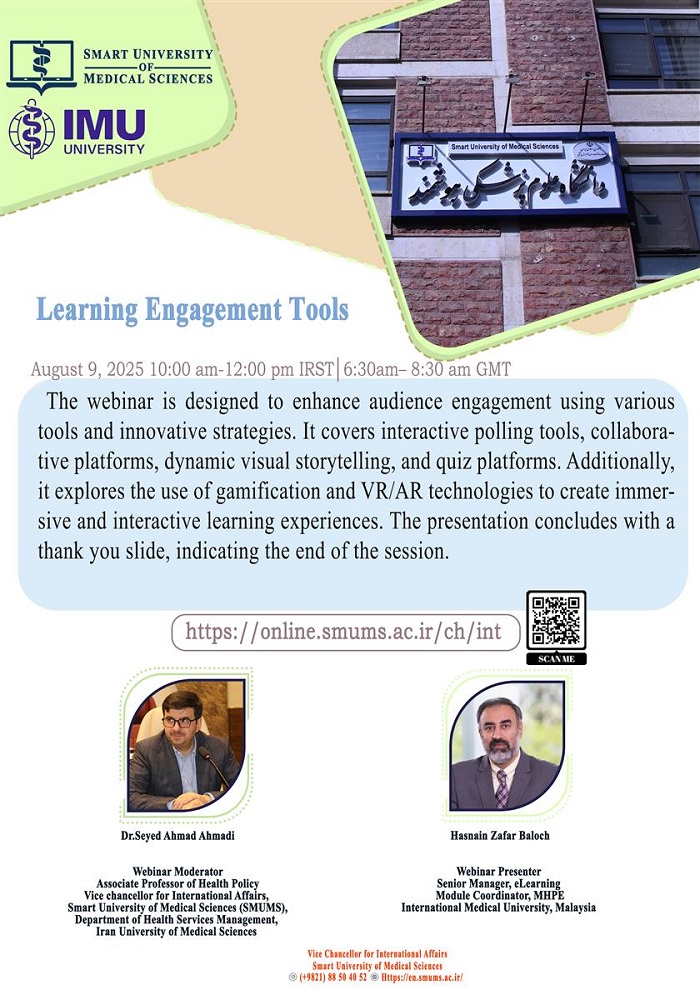 به اطلاع اعضای هیئت علمی، دانشجویان و سایر علاقه مندان می رساند، دانشگاه علوم پزشکی هوشمند در نظر دارد، وبینار بین المللی با عنوان " Learning Engagement Tools " با سخنرانی جناب آقای دکتر حسنین ظفر بلوچ، از دانشگاه علوم پزشکی بین المللی مالزی (IMU) را به صورت بر خط برگزار نماید.