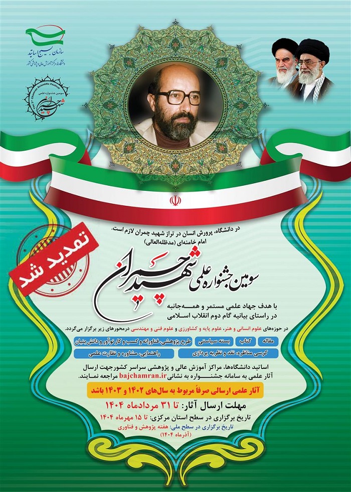 به اطلاع اعضای هیئت علمی و اساتید مدعو می رساند، سومین جشنواره دو سالانه علمی شهید چمران، با هدف اصلی ترویج و تعمیق علمی مستمر و همه جانبه، در راستای تحقق اهداف بیانیه گام دوم انقلاب اسلامی، در شش محور 1 - کتاب 2 - مقاله 3 - طرح های پژوهشی و فناورانه و کسب و کار نوآور 4 - راهنمایی، مشاوره، نظارت و راهبری پایان نامه ها، رساله ها و پروژه ها 5 - بسته سیاستی 6 - کرسی نظریه پردازی نقد و مناظره، به منظور ارج نهادن و اهمیت بخشیدن به نقش برجسته و تلاش نهضت استادی بسیج و نیز تمامی استادان دانشگاه ها و مراکز آموزش عالی و پژوهشی استان در سال 1404 توسط سازمان بسیج اساتید برگزار می شود و مهلت ارسال آثار تا پایان مردادماه تمدید گردیده است.