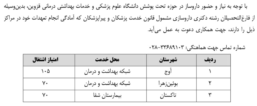 جذب نیروی داروساز مشمول قانون خدمت ۲۵ آذر ۱۴۰۴ | ۰۹:۰۰ کد : ۵۷۰۵۷ اطلاعیه ارسال به دیگران نام شما ایمیل شما ایمیل دریافتکننده ارسال انصراف تعداد بازدید:۶۲۵ جذب نیروی داروساز مشمول قانون خدمت در دانشگاه علوم پزشکی قزوین