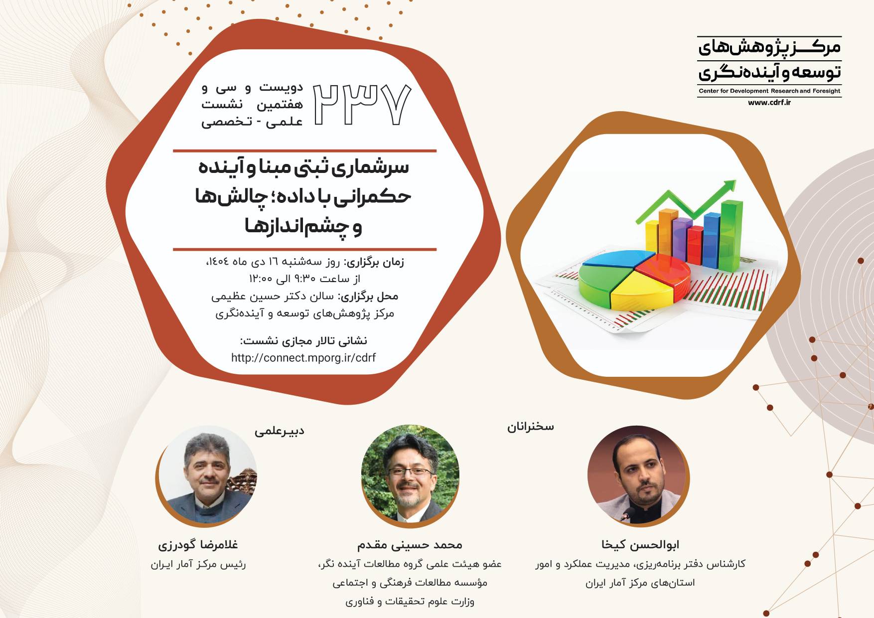 نشست علمی سرشماری ثبتی مبنا آینده حکمرانی با داده ۱۴ دی ۱۴۰۴ | ۱۰:۲۱ کد : ۵۷۴۱۸ اطلاعیه ارسال به دیگران نام شما ایمیل شما ایمیل دریافتکننده ارسال انصراف تعداد بازدید:۷۲۴ دویست وسی وهفتمین نشست علمی - تخصصی با عنوان سرشماری ثبتی مبنا آینده حکمرانی با داده، چالش ها وچشم اندازها