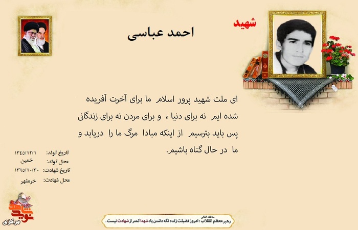 فرازی از وصیت نامه شهدا ۱۳ دی ۱۴۰۴ | ۱۰:۰۱ کد : ۵۷۴۶۹ اطلاعیه ارسال به دیگران نام شما ایمیل شما ایمیل دریافتکننده ارسال انصراف تعداد بازدید:۳۴۰ فرازی از وصیت نامه شهدا فرازی از وصیت نامه شهید بزرگوار احمد عباسی :