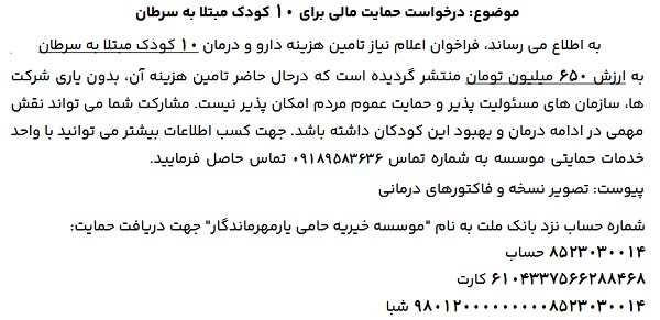 درخواست حمایت مالی، برای ۱۰ کودک مبتلا به سرطان ۰۷ بهمن ۱۴۰۴ | ۱۱:۳۳ کد : ۵۷۷۳۲ اطلاعیه ارسال به دیگران نام شما ایمیل شما ایمیل دریافتکننده ارسال انصراف تعداد بازدید:۳۷۰ موسسه خیریه حامی یار، درخواست حمایت مالی، برای ۱۰ کودک مبتلا به سرطان را دارد.