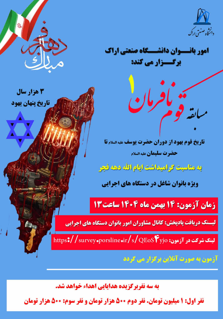 مسابقه قوم نافرمان ۰۸ بهمن ۱۴۰۴ | ۱۰:۳۹ کد : ۵۷۷۴۳ اطلاعیه ارسال به دیگران نام شما ایمیل شما ایمیل دریافتکننده ارسال انصراف تعداد بازدید:۵۲۳ برگزاری مسابقه قوم نافرمان، در ایام الله دهه فجر